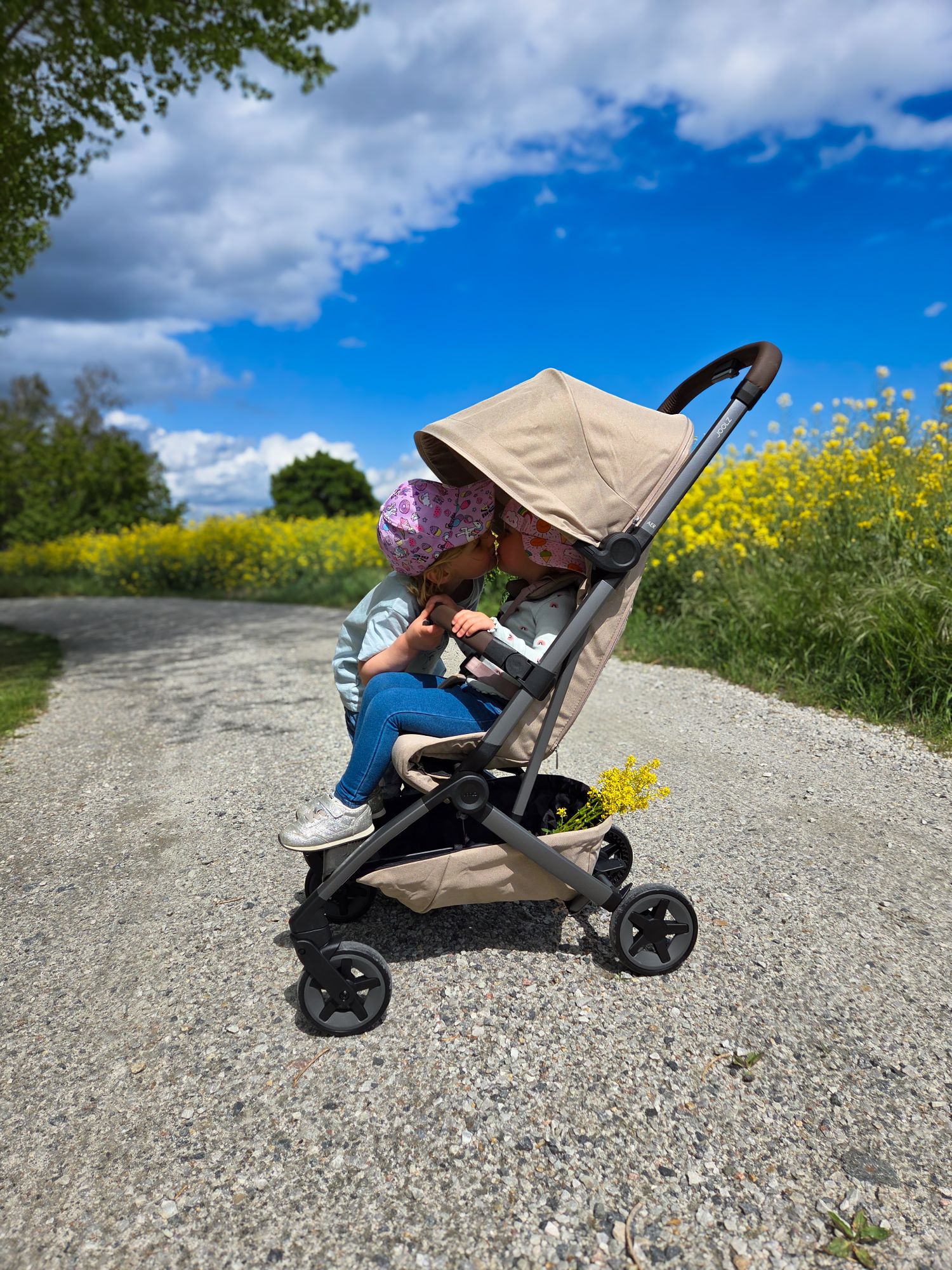 Två små barn sitter i en Joolz Aer2 barnvagn på en grusväg, omgivna av grönska och gula blommor under en klar blå himmel.